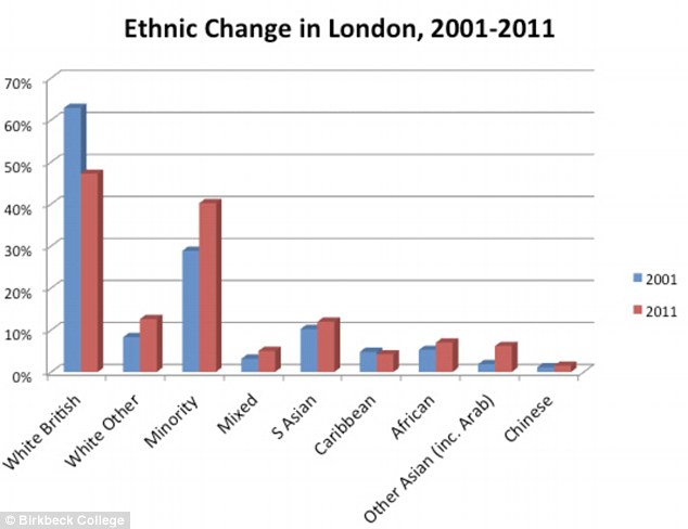 Mientras tanto, la población blanca británica en muchos distritos suburbanos y rurales se ha disparado, según un estudio elaborado por el Birkbeck College, Universidad de Londres, junto con Demos.